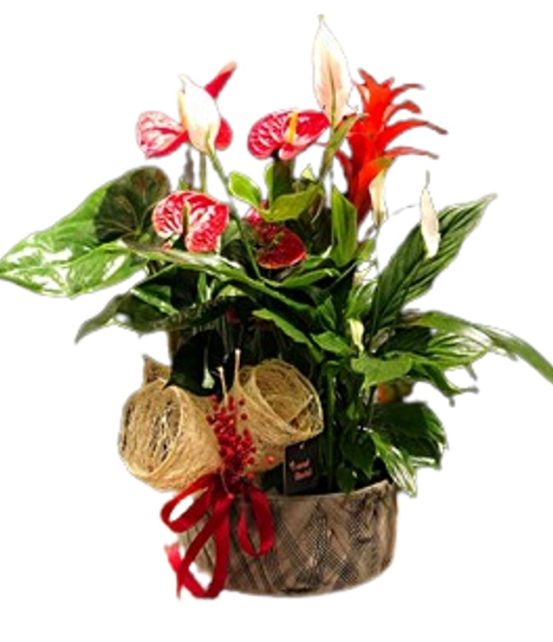 Dekoratif Saksı İçinde Antoryum Çiçeği Guzmania Çiçeği Spathifillium Çiçeği İthal garnütürlerle düzenlenmis İç Mekan Kullanımları için uygun tropik bitki arajmanı